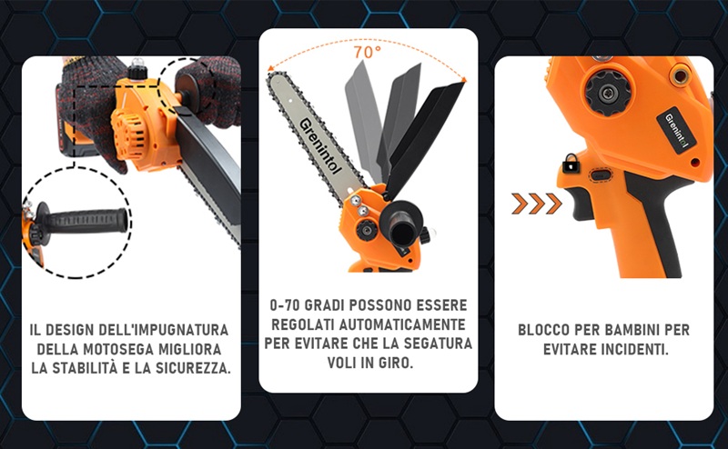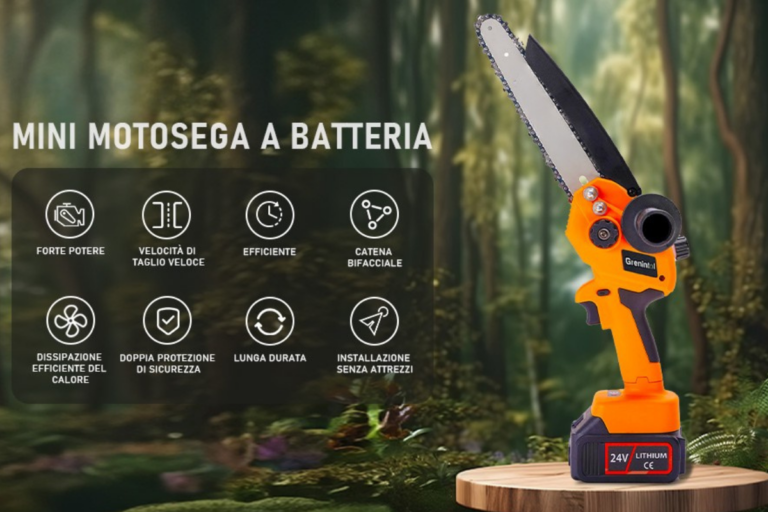 Compatta, leggera e maneggevole, la mini motosega a batteria è lo strumento ideale per potature veloci e lavori di giardinaggio senza fatica. Grazie alla sua lama affilata e al motore potente, permette di tagliare rami e legna con precisione, senza il limite dei cavi. La batteria ricaricabile garantisce un’autonomia prolungata, mentre il design ergonomico assicura una presa salda e sicura. Perfetta per chi cerca un’ alternativa pratica ed efficiente alle motoseghe tradizionali!